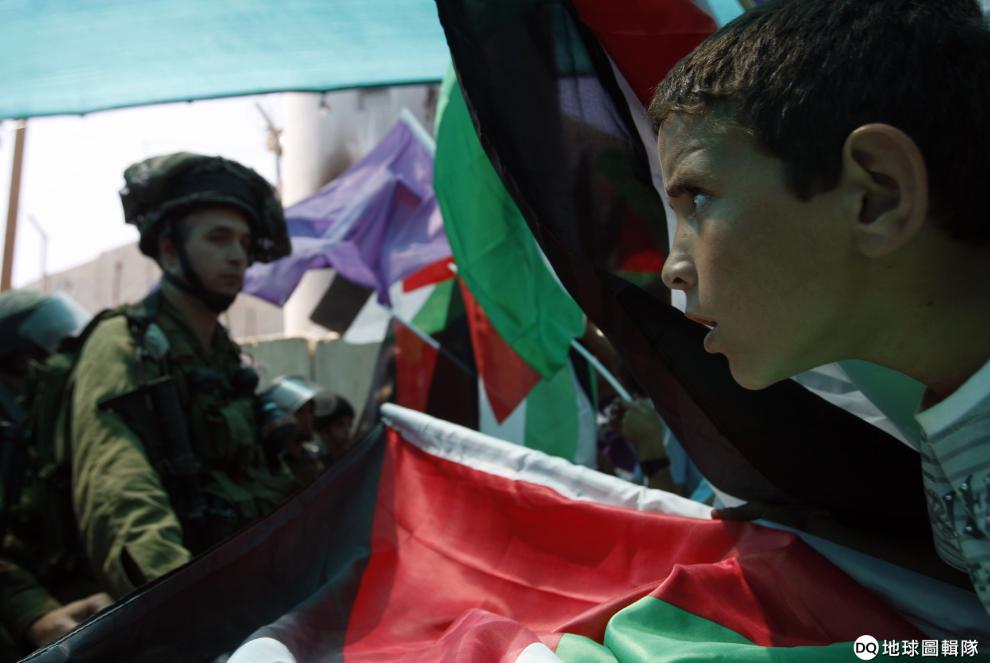 在約旦河西岸、巴勒斯坦領土拉姆安拉(Ramallah)的以色列檢查哨旁,一名巴勒斯坦小男孩拿著國旗看著以色列軍人。許多以色列鷹派分子認為,境內的阿拉伯裔公民同情巴勒斯坦人是叛國的行為。