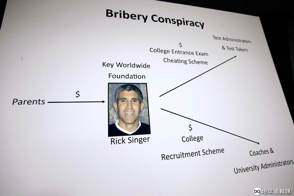 圖為一張辛格如何協助有錢父母將孩子送入菁英大學的海報。目前辛格以 1,553萬元交保候傳。