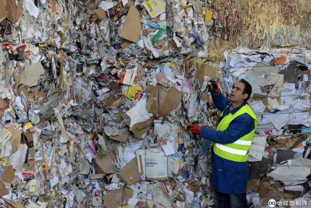 德國紙類回收處理場內,主管正在整理小山一般的廢紙。