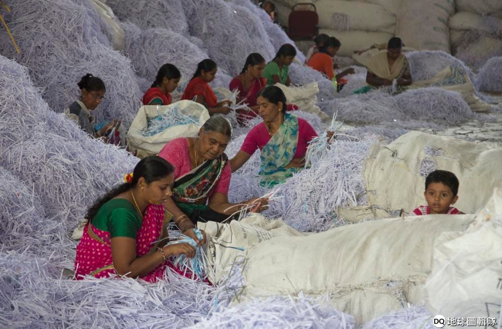 而古吉拉特邦西部的紙類回收場裡,漂洋過海的廢紙仍在不斷增加,由身穿顏色鮮豔的傳統紗麗的印度婦女耐心分類,等待進一步的回收處理。
