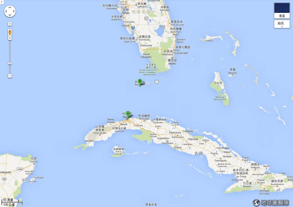 路透社娜亞德挑戰的路線是從古巴的哈瓦那海岸(圖中A點),一路游到美國佛羅里達州的基威斯特海邊(圖中B點),總長約170公里遠