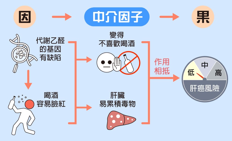 代謝乙醛的基因有缺陷,會造成人們不喜歡喝酒(間接作用),但肝臟也會容易累積毒物(直接作用)。兩個作用相抵,對於肝臟不會造成顯著的罹癌風險。