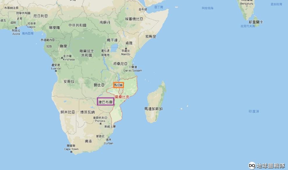 圖為東非國家莫三比克(紅)、馬拉威(橘)和辛巴威(紫)的相對位置,這三國受到熱帶氣旋伊達重創。