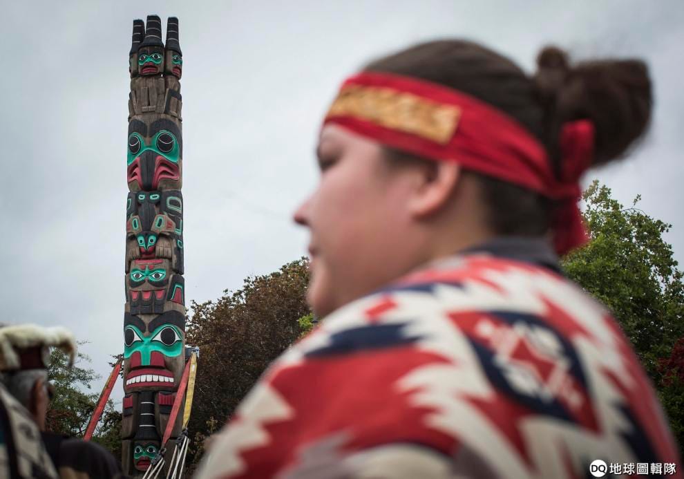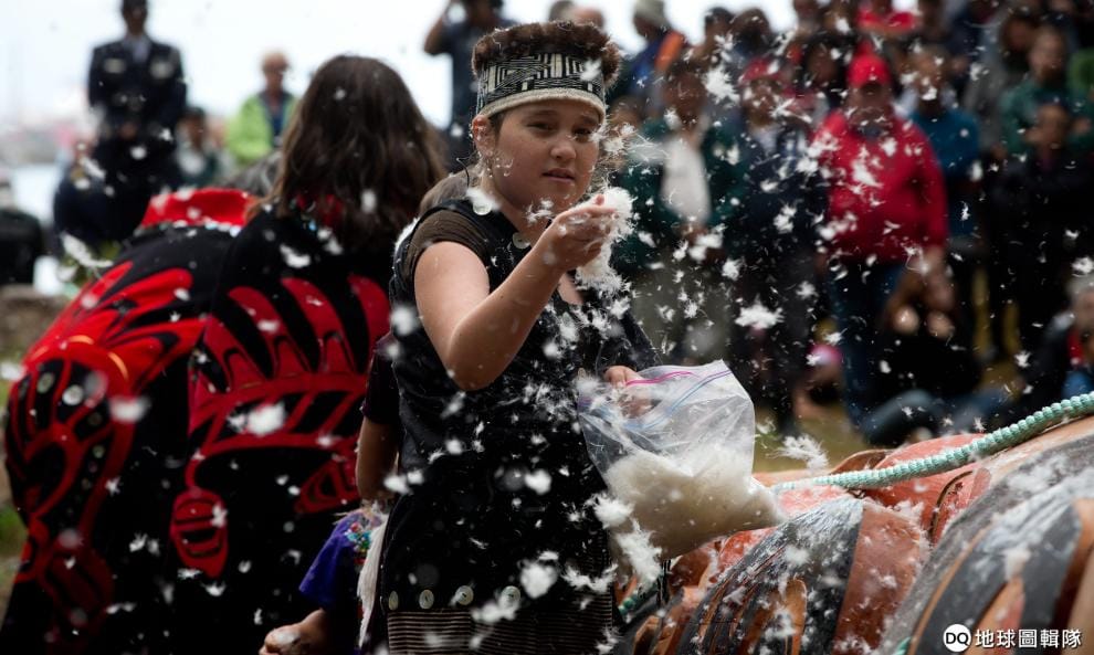 美聯社 / 達志影像在立起圖騰柱前,身穿傳統服飾的海達少女朝圖騰柱灑下羽毛。