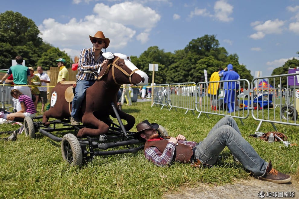 路透社法國,牛仔主題風格的參賽團隊在一旁休息