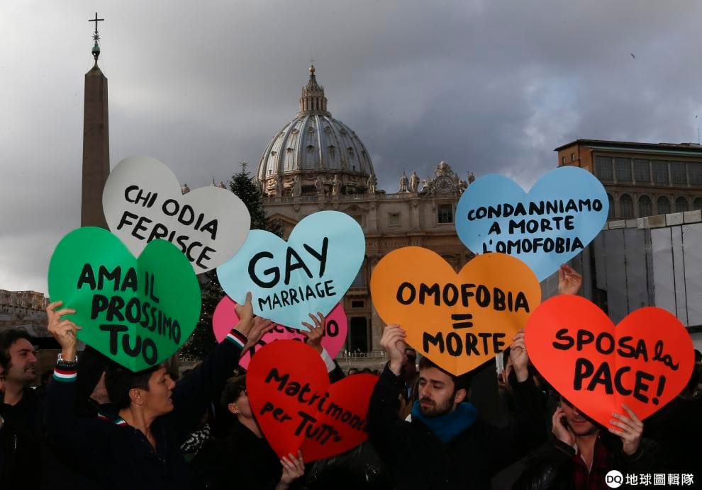 2012年,一群同志平權運動者在梵諦岡聖彼得大教堂廣場抗議天主教會反對同志婚姻。