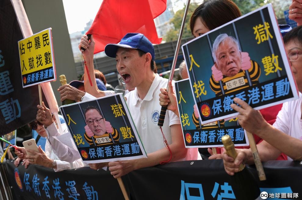 9號這天,在香港西九龍法院的另一頭,親中的民眾高舉中國五星旗,手拿「佔中九子」被關入監獄的海報,稱他們是暴民應該被定罪受刑。