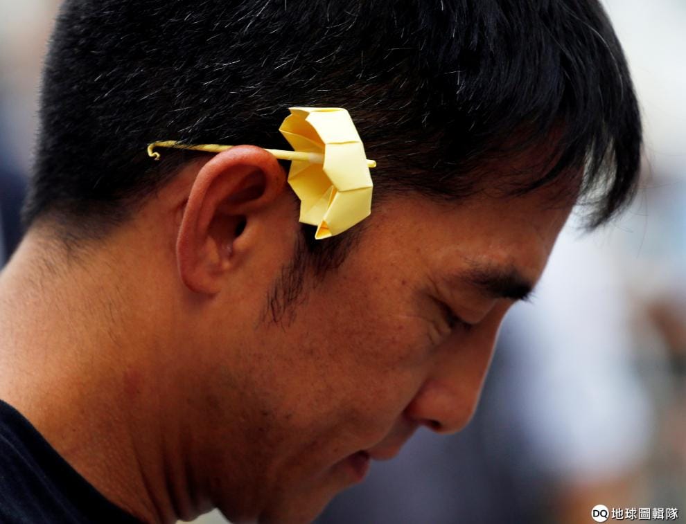 2016年9月28日,在佔中運動兩周年紀念日上,一名男子在耳朵插上一支小黃傘紀念這場革命。