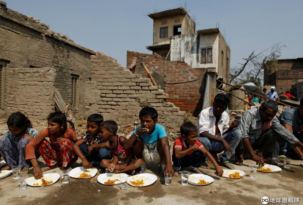 路透社 / 達志影像賑災期間,受災害影響的村莊孩童在災難現場填飽肚子。