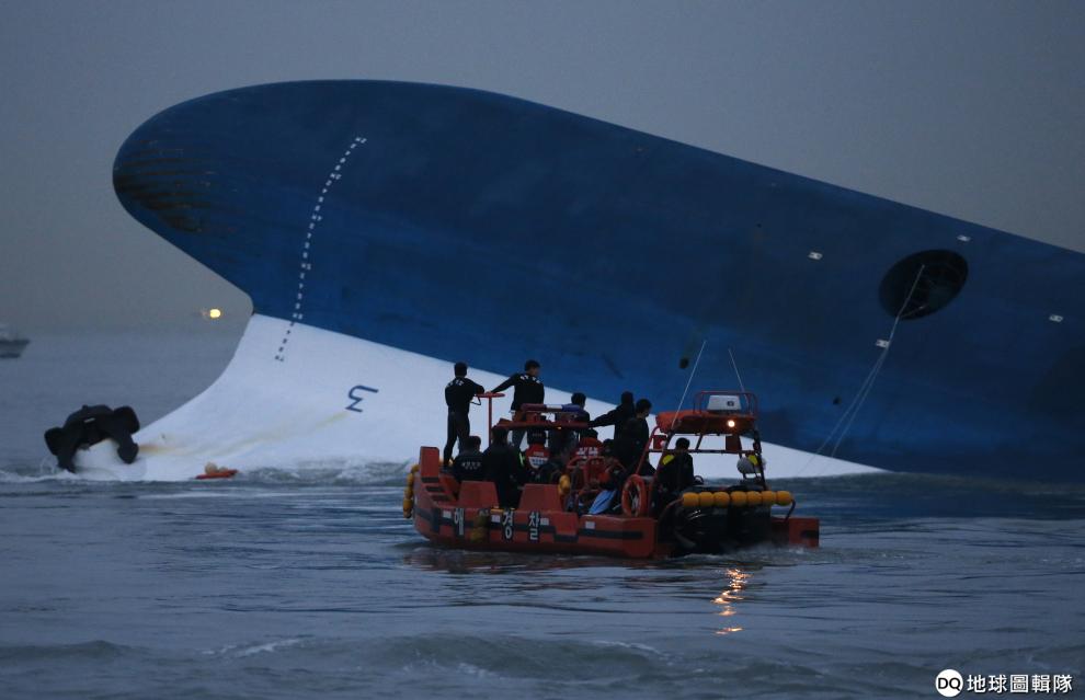 圖為 2014年4月16日時,在世越號翻覆地點拍攝到的現場照片,可以看到一艘能搭載上百人的渡輪在救難人員的眼前緩緩下沉。