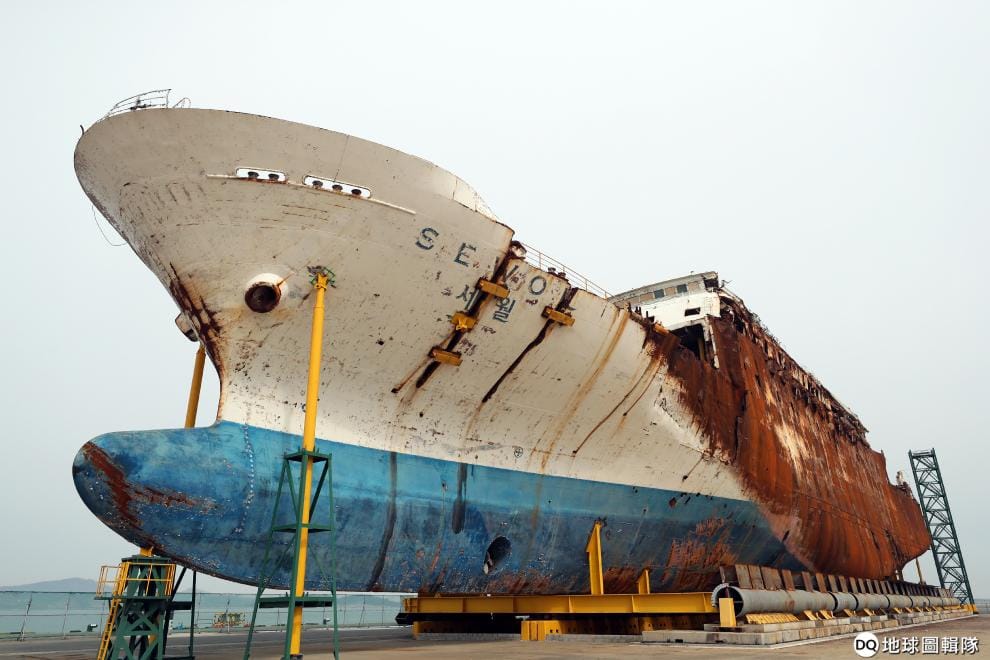 圖為 2017年被打撈上岸後,擺放在木浦市(Mokpo)港口的世越號船身。