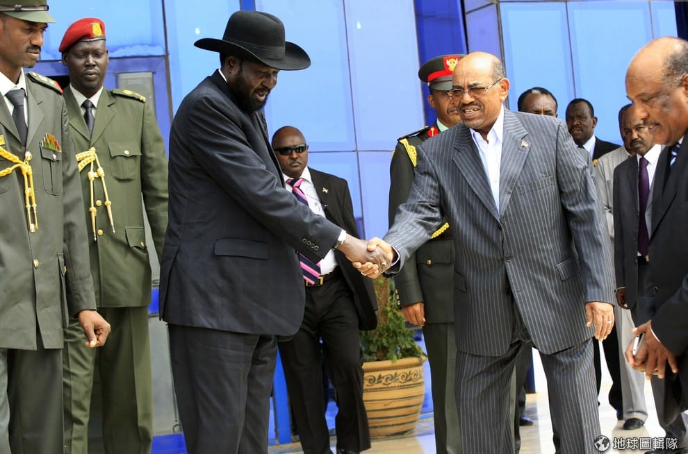左起第三位是南蘇丹總統基爾(Salva Kiir),照片中基爾正和蘇丹總統巴希爾(Omar al-Bashir)握手。