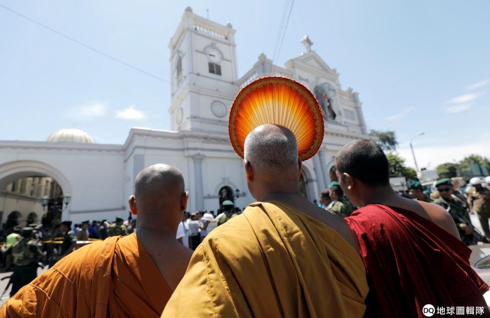 在遭炸彈攻擊的聖安東尼教堂前,數名佛教僧侶看著眼前的大批警力。