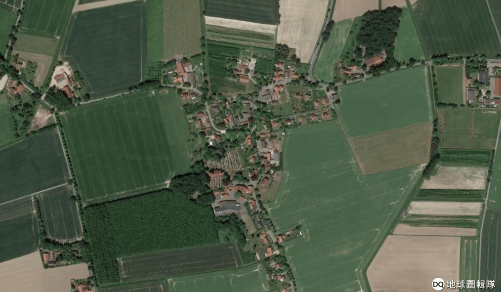 德國北方的希爾格爾米森不但沒有路名,當地居民還二度反對政府推行道路命名方案。圖為希爾格爾米森鎮中心的Google Maps衛星圖。