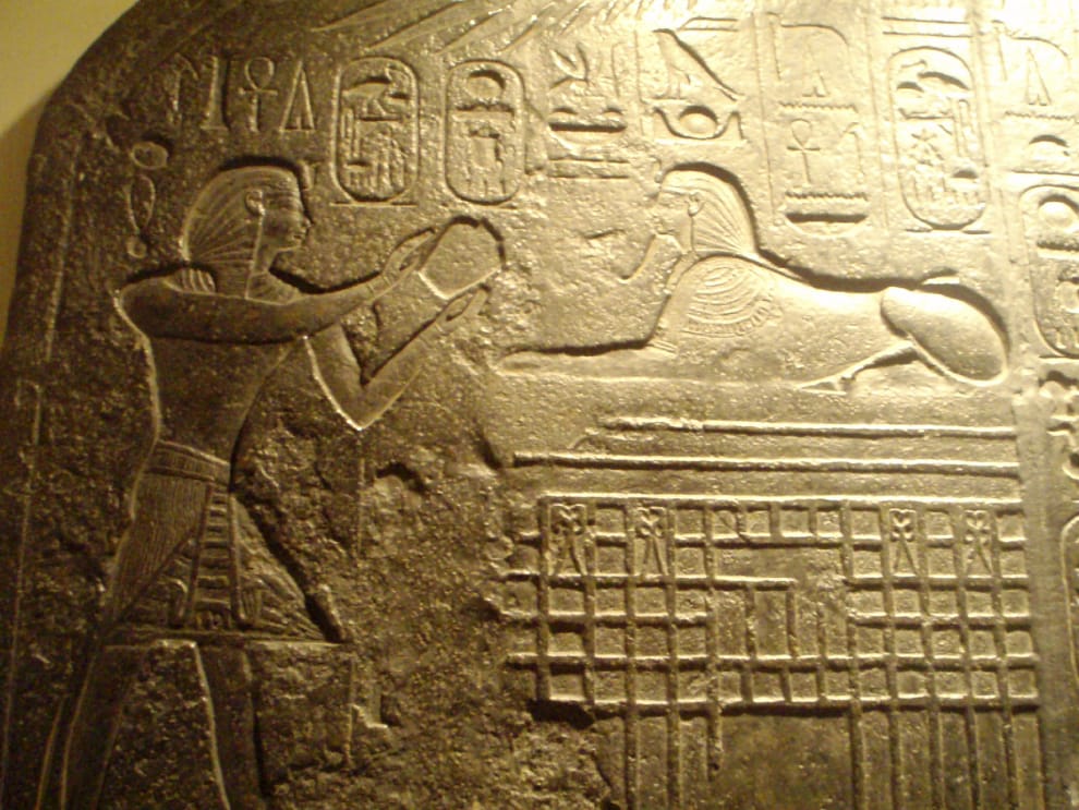 圖為記載埃及法老圖特摩斯四世夢境的「記夢碑」複製品,上頭的記載初步判定了人面獅身像的臉究竟是誰。