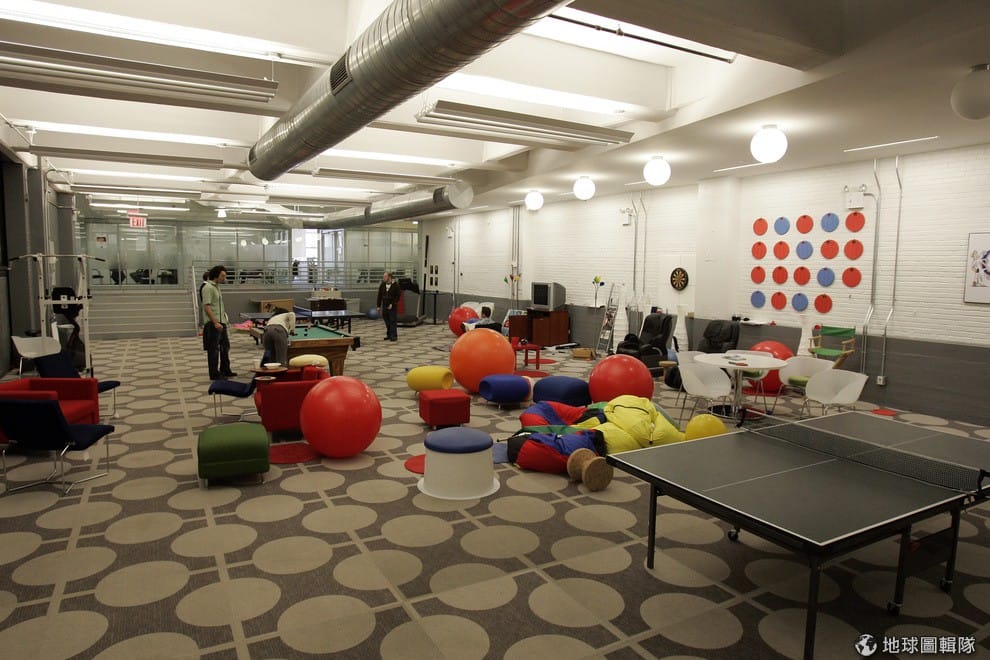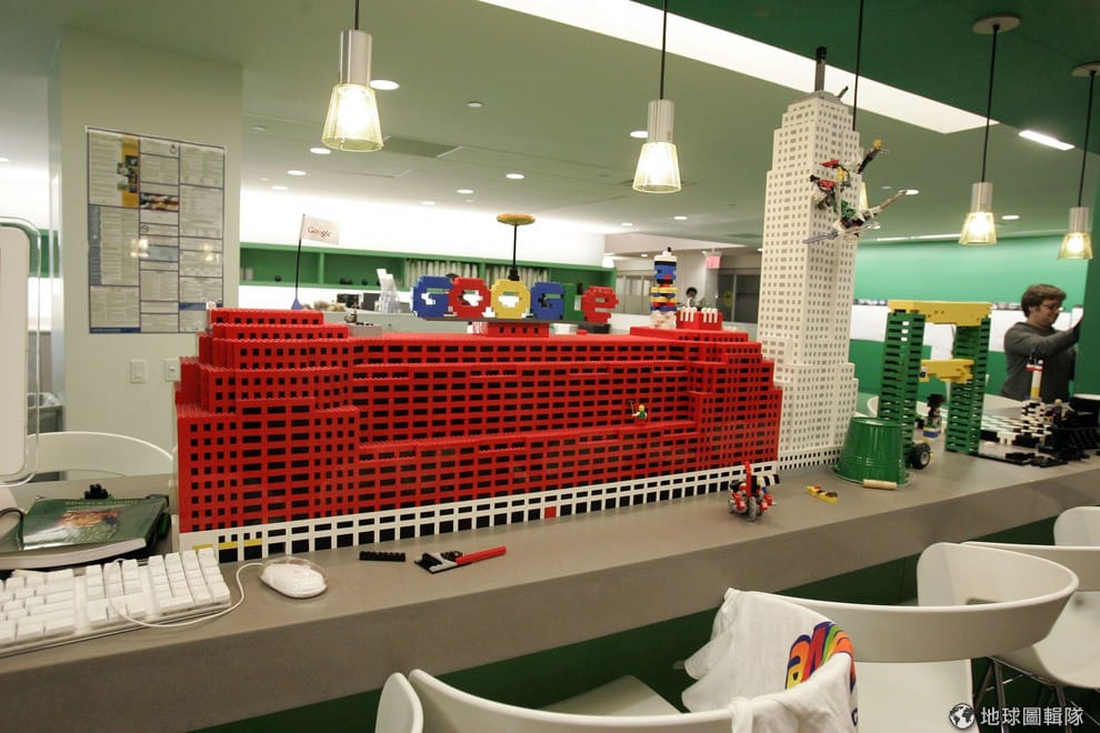 路透社Google紐約分公司一景,員工把樂高堆成Google的標誌。光是在紐約的分公司就有4間咖啡店、35間「微型廚房」在其中。