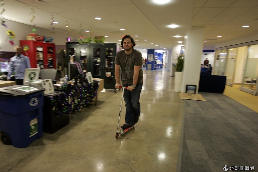 路透社一名員工正在騎公司內的滑板車。