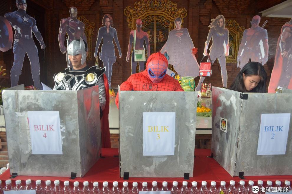 在 17號印尼大選當天,為了鼓勵人們出來投票,許多地區都會特別裝飾投票所,像是畫面中以電影《復仇者聯盟4》的角色為主題。有的選務人員則會打扮成印尼民俗信仰的鬼魂、神祇等等。