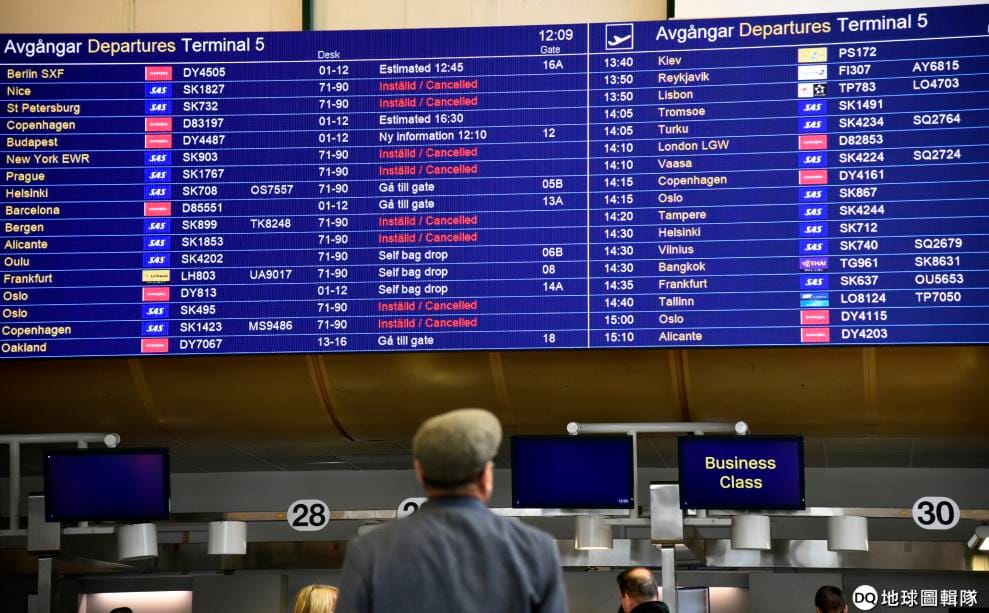 瑞典斯德哥爾摩-阿蘭達機場的班機時刻表上,北歐航空的班機全以紅色字樣標示取消。