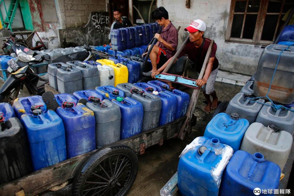 由於基礎建設落後、民生汙染嚴重,雅加達仍有許多居民家中沒有完善的自來水系統,需要仰賴抽取地下水來應付民生用水需求。圖為雅加達北部,集水站的員工將大量塑膠桶裝滿水後,送至沒有自來水或水井的家庭。