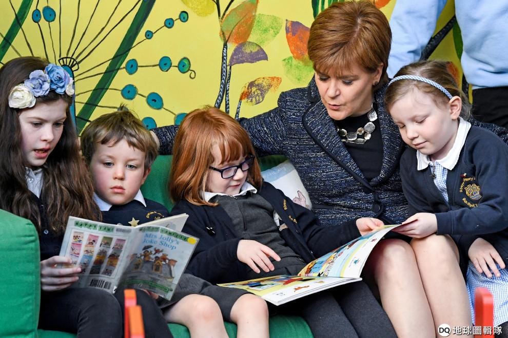 帕克菲爾德社區小學在一系列「沒有邊緣人」性平教育課程中帶領學生閱讀與同志關係有關的童書,部分家長認為此舉等同鼓勵孩童參與同志關係。圖為蘇格蘭首席部長與英國小學學生共讀童書。