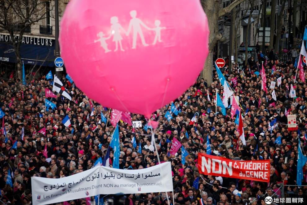 為了向學校施壓,許多家長在伯明翰的小學校外進行長達數星期的示威抗議行動。圖為 2014年法國反同性婚姻遊行中,一顆氣球上印著傳統家庭的形象。