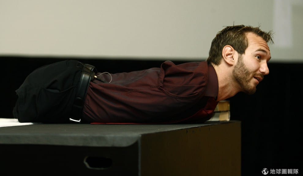 今年 30歲的胡哲患了「先天性四肢切斷症」,天生就沒有雙手和雙腳,只有在左側臀部的位置有個帶有 2根腳趾的小「腳」。樂觀的他並沒有因此而沮喪,幽默面對生命,他熱愛游泳,還會踢足球、玩高爾夫、高空跳傘。