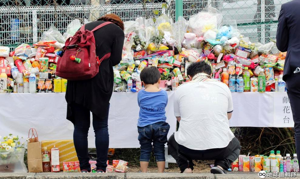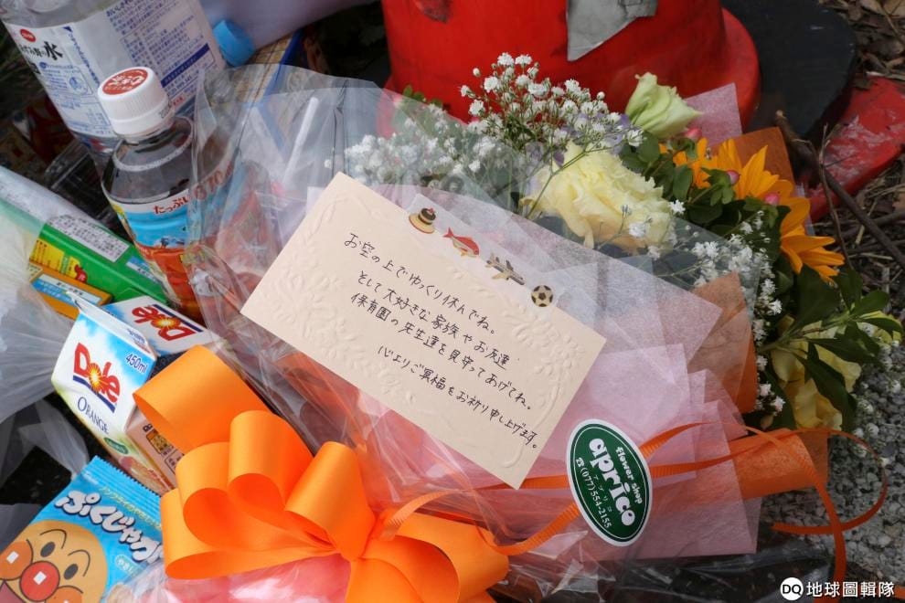 一束擺在哀悼現場花束的字卡上寫著:「在天上好好休息吧,然後守護著最喜歡的家人、朋友還有保育園的老師們。」