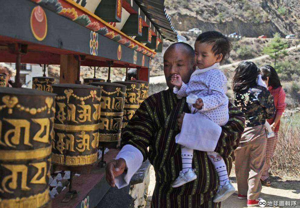 不丹居民抱著小孩,轉動藏傳佛教的轉經輪。