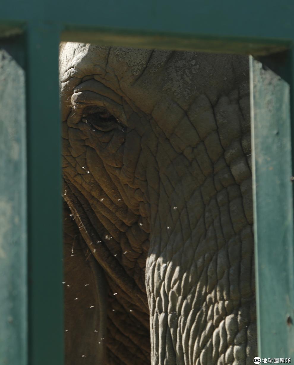 南非約翰尼斯堡動物園中,一隻 39歲的母象從柵欄之間往外看。