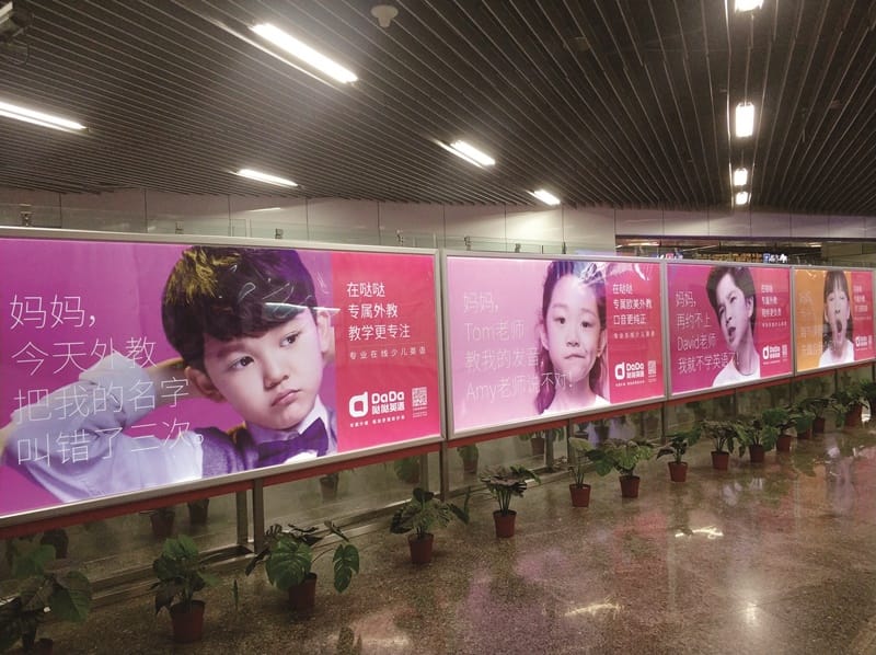 上海地鐵站內,一家英文補教機構買下大幅廣告版面。