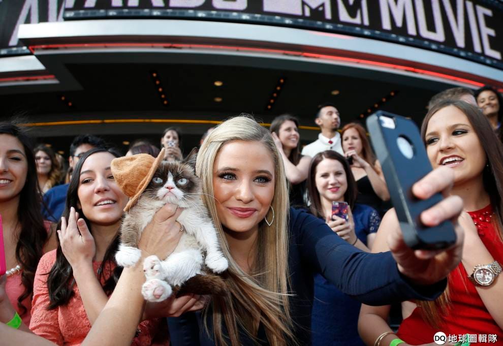 2014年,不爽貓出席美國洛杉磯MTV影視大獎時,與熱情的粉絲一起自拍合照。