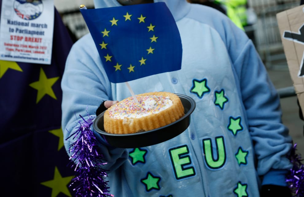2017年1月在英國,一名支持留歐的示威者走上街頭抗議。