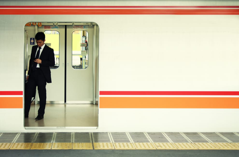 在日本電車上,一名上班族正在低頭查看手機。