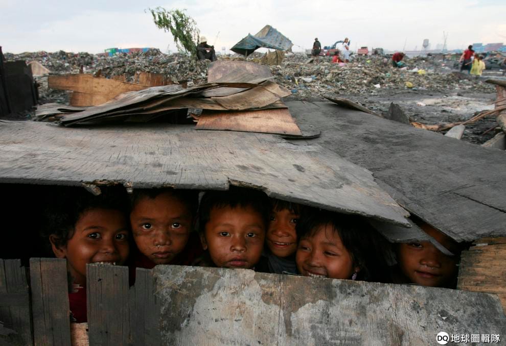 住在菲律賓垃圾場附近的孩童,在殘破的大型垃圾中玩耍。