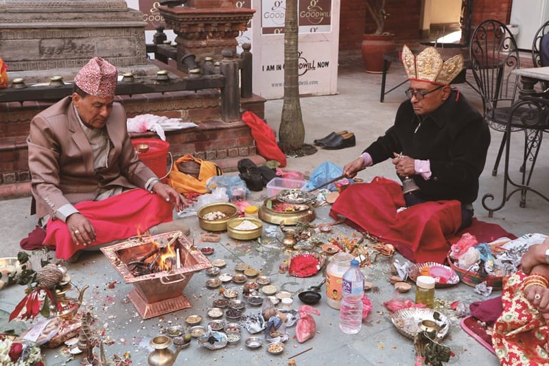合作夥伴對我們而言,這場婚禮著實讓人大開眼界。新郎家族是尼瓦族(Newar)佛教祭司階級。尼瓦人為首都加德滿都谷地的主要住民,為尼泊爾人數第六多的族群,說隸屬漢藏語系的尼瓦語,而所信仰的尼瓦佛教,混雜了印度教與密宗元素。