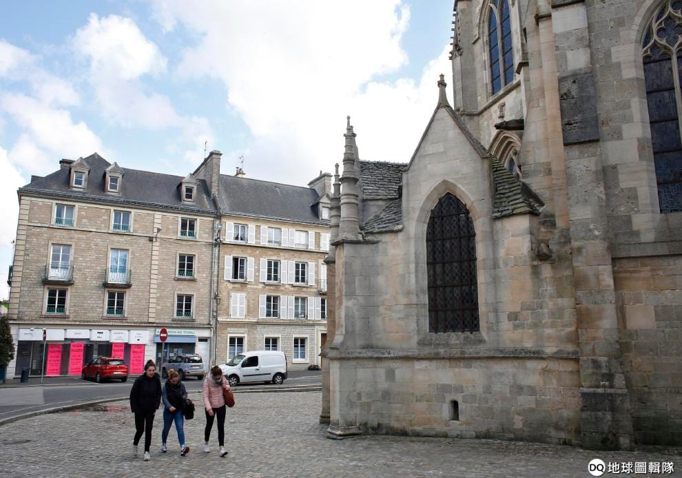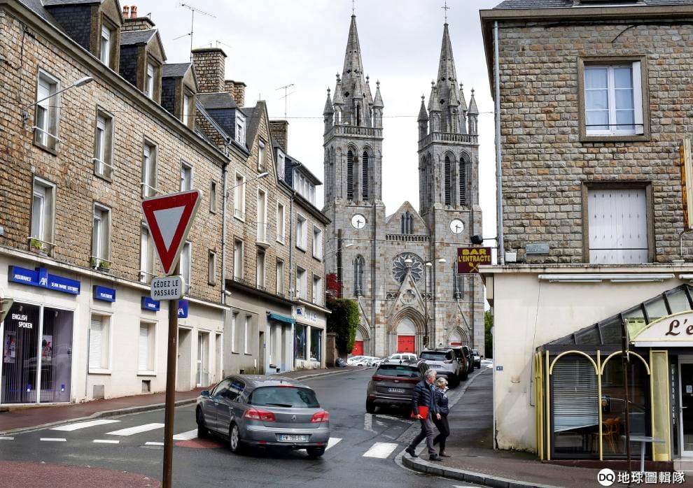 美聯社 / 達志影像在聖伊萊爾-迪阿庫埃鎮(Saint-Hilaire-du-Harcouet),有兩座塔樓的聖伊萊爾教堂(St. Hilaire Church)是戰時僅存的建築之一。戰後,人們沿著聖伊萊爾教堂重建社區,現在看到的是井然有序的磚房還有一間標榜「會說英文」的保險辦公室。