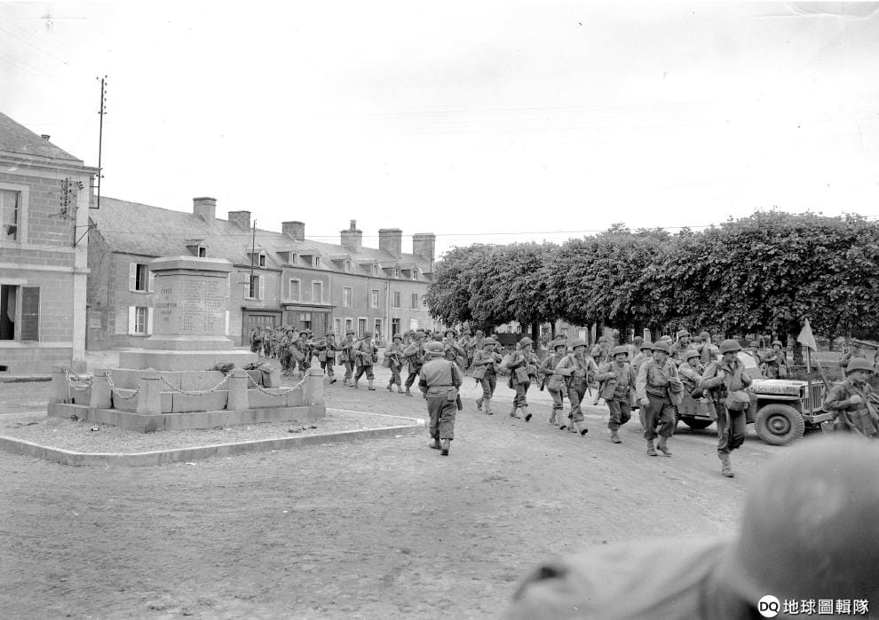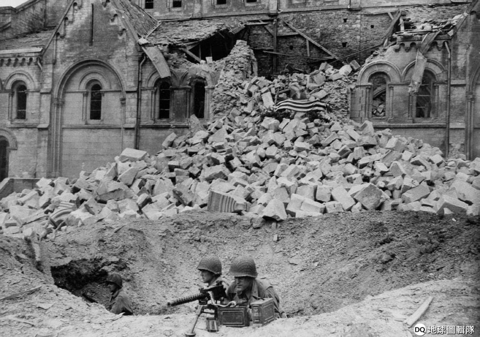 1944年7月23日,在法國諾曼第聖洛鎮可以看到蓋著美國國旗的屍體就在壕溝的上方,原本的天主教堂屋頂遭到破壞,盟軍們則拿著機關槍在壕溝中待命。現在,原址鋪上了平整的柏油,再也看不到壕溝的原貌。