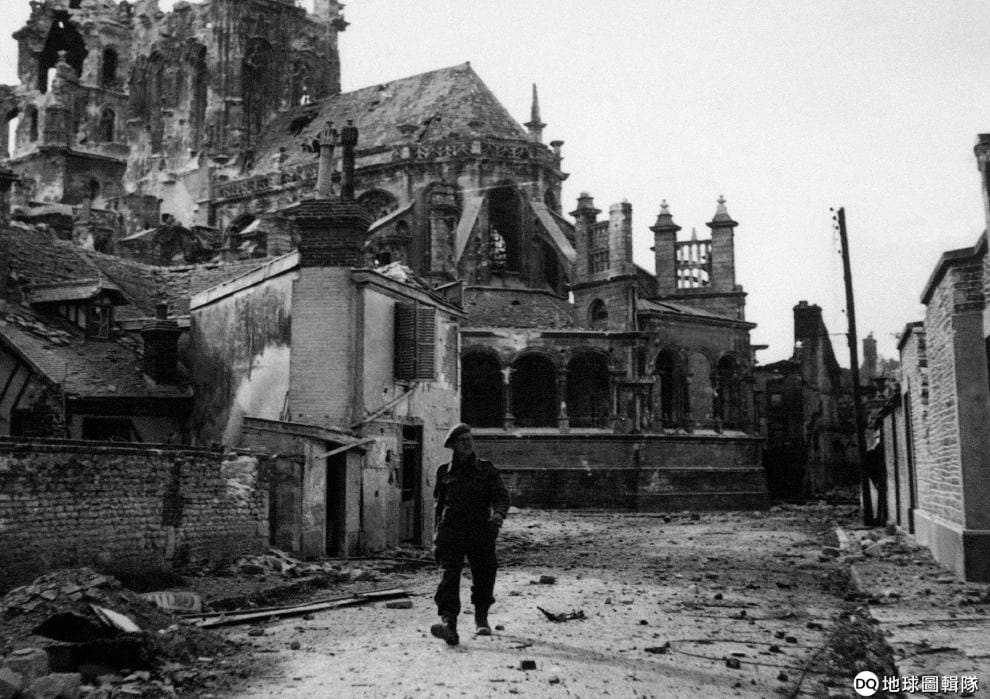 1944年8月,英國大兵靠著鋼樑度過底下不穩的廢墟,一旁就是被破壞地亂七八糟的教堂。現在,從教堂的外觀已經很難看出這裡曾有一場大戰。