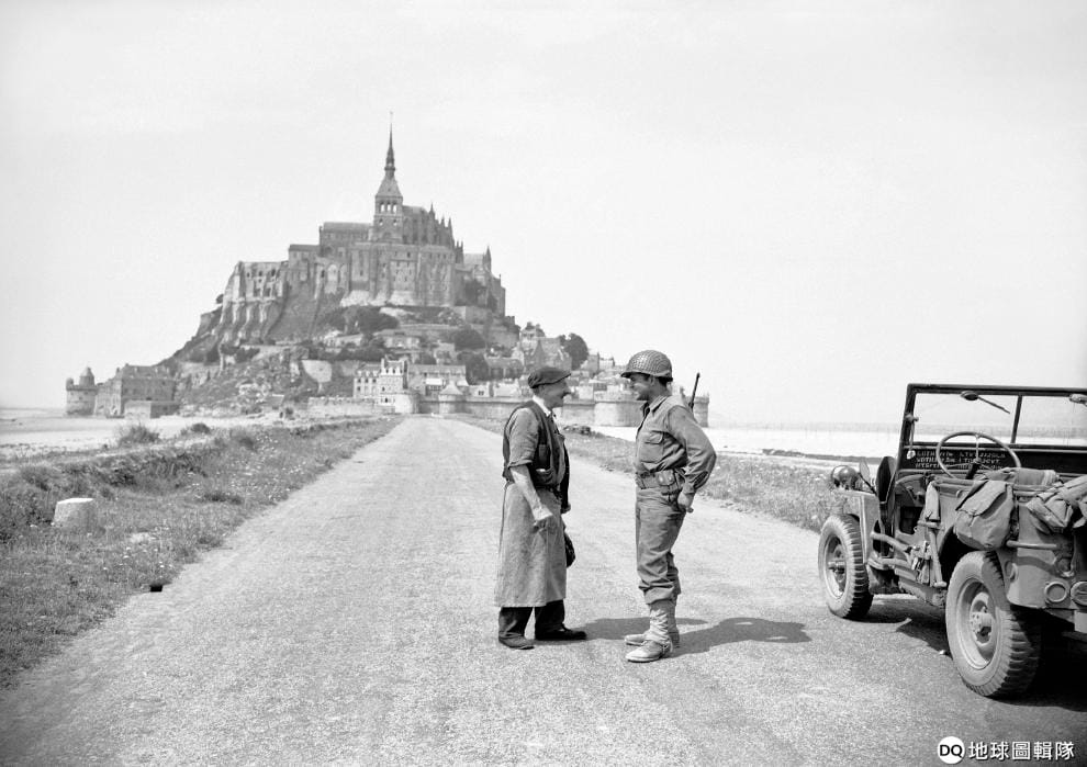 1944年8月8日,一名美國大兵正在和一名法國平民聊天,他們身後就是法國重要的歷史遺跡──聖米歇爾修道院。現在,這裡每天都有大量的觀光客前來參觀。