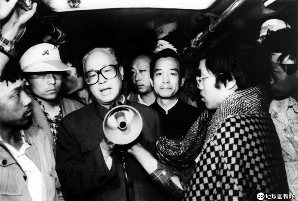 5月19日,反對武力鎮壓學生的趙紫陽(拿大聲公者)前往天安門廣場,呼籲學生放棄絶食卻未果,當時他不斷告訴學生:「我們來得太晚了。」