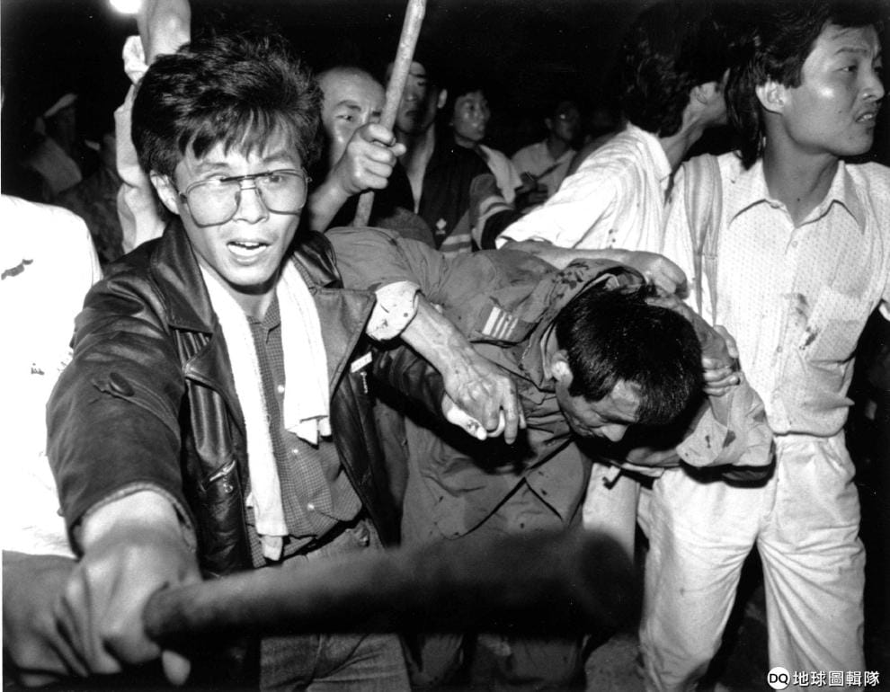 學生們護送著一名遭到民眾毆打的坦克駕駛。在那個夜晚,許多激憤的民眾將他們的怒火指向士兵、坦克駕駛,有些士兵因而遭到毆打甚至殺害。