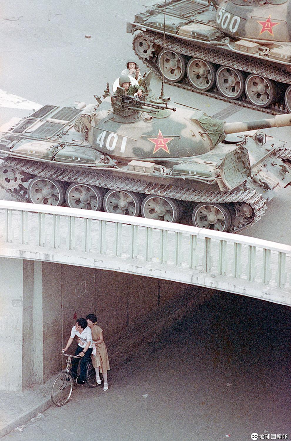 圖為 6月5日,一對情侶以地下道為掩護,迴避正在巡邏的中國人民解放軍。
