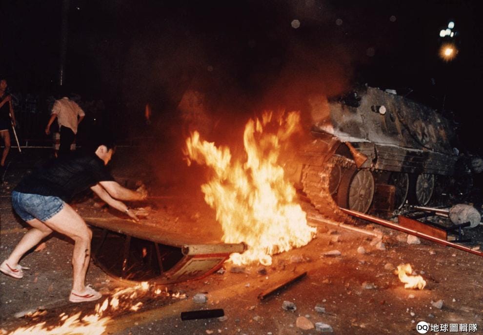 有些民眾則是朝坦克扔出汽油彈,希望可以阻止坦克的前進。
