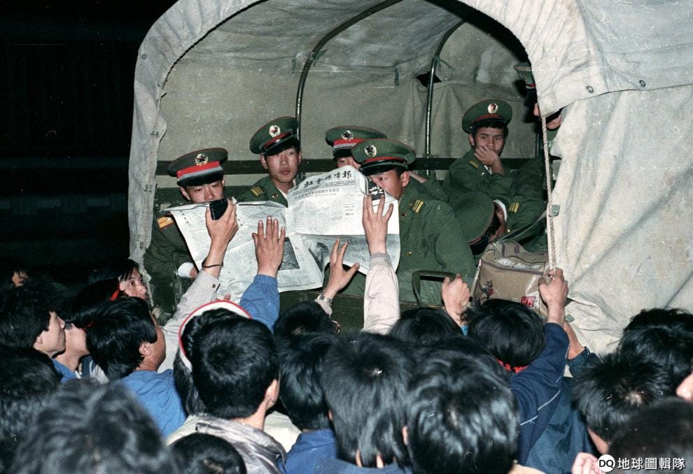 5月20日,示威者朝士兵展示描述了「八九民運」的報導。這一天,中國政府宣布戒嚴,並開始有軍隊進駐北京,人們則用巴士、柵欄、直接包圍等方式阻擋士兵的去路、或是勸這些士兵離開現場。