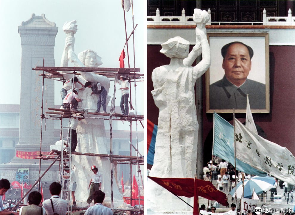 5月30日,八所中國大學、共二十多名學生共同打造了民主女神雕像,以此向示威民眾致意。「民主女神」後來也成為六四事件中的重要標誌,在那之後,許多地方都能找到「民主女神」的複製品。圖分別拍攝於 5月30日、6月4日。