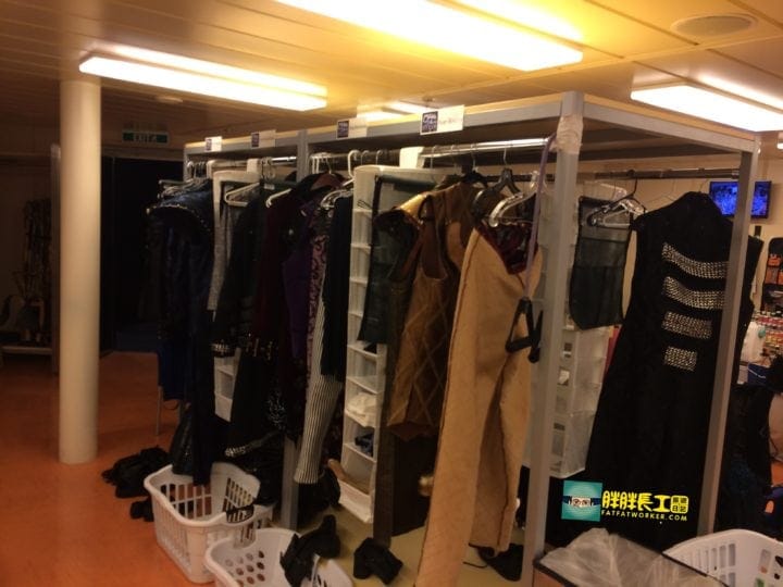 接著我們一行人慢慢的走到後台戲服區,類似演員的更衣室。舞台總監說,他們的戲服有專人會清洗,表演者每天只要上妝、穿衣服、表演、換衣服,就OK了。其他都有專責的人來打理這些服裝。