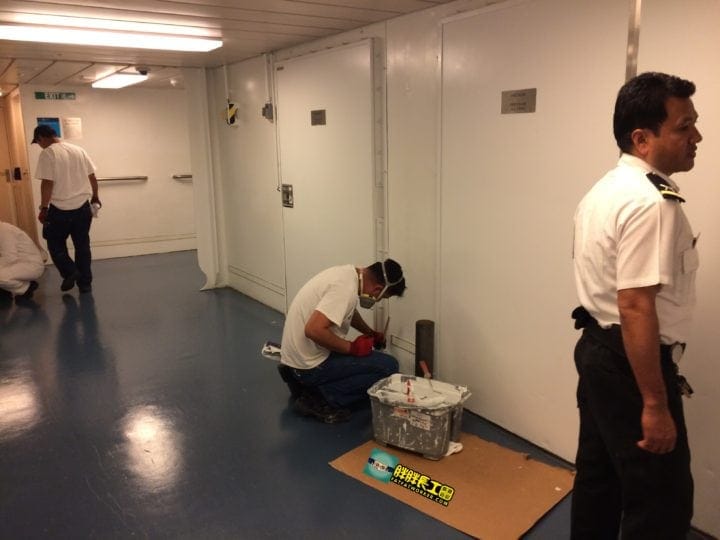 意外捕捉到,工作人員在補塗油漆,確保郵輪不會生鏽。
