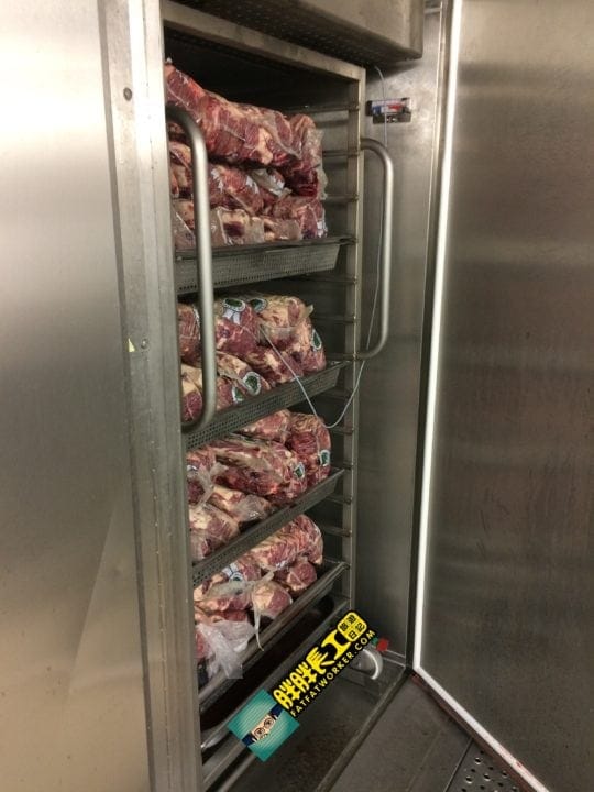 照片裡看到的,是肉品的調理室。冷凍庫裡的,都是最原始的狀態,不論是筋膜或是多餘的肥肉,都會在這裡切掉。這一張照片裡,就是兩三個廚師,處理不同部位肉品的過程,按照不同的用途,留下必要的部位。