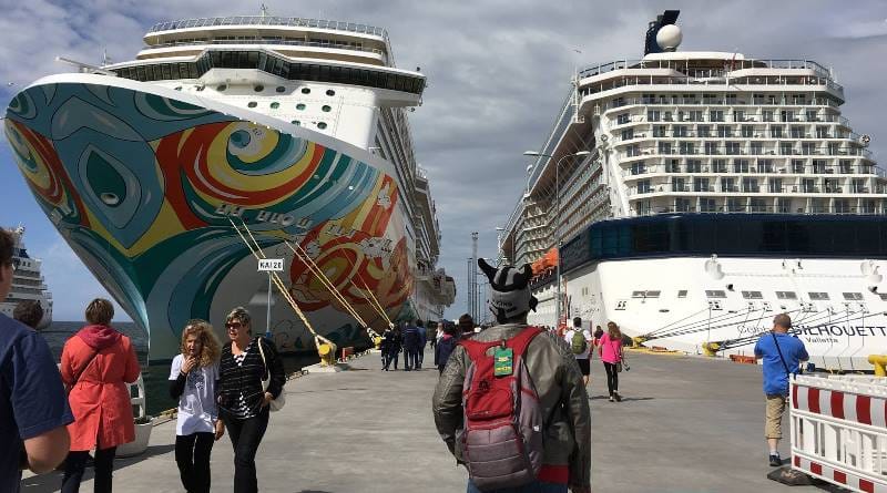 右邊黑色衣服戴眼鏡的就是隨團領隊,他全程陪伴著大家,並負責導覽。看起來還蠻年輕的,但是實際上已經在NCL郵輪公司工作將近20年了,非常的資深。他介紹了從遠古時期到現在NCL的演進。